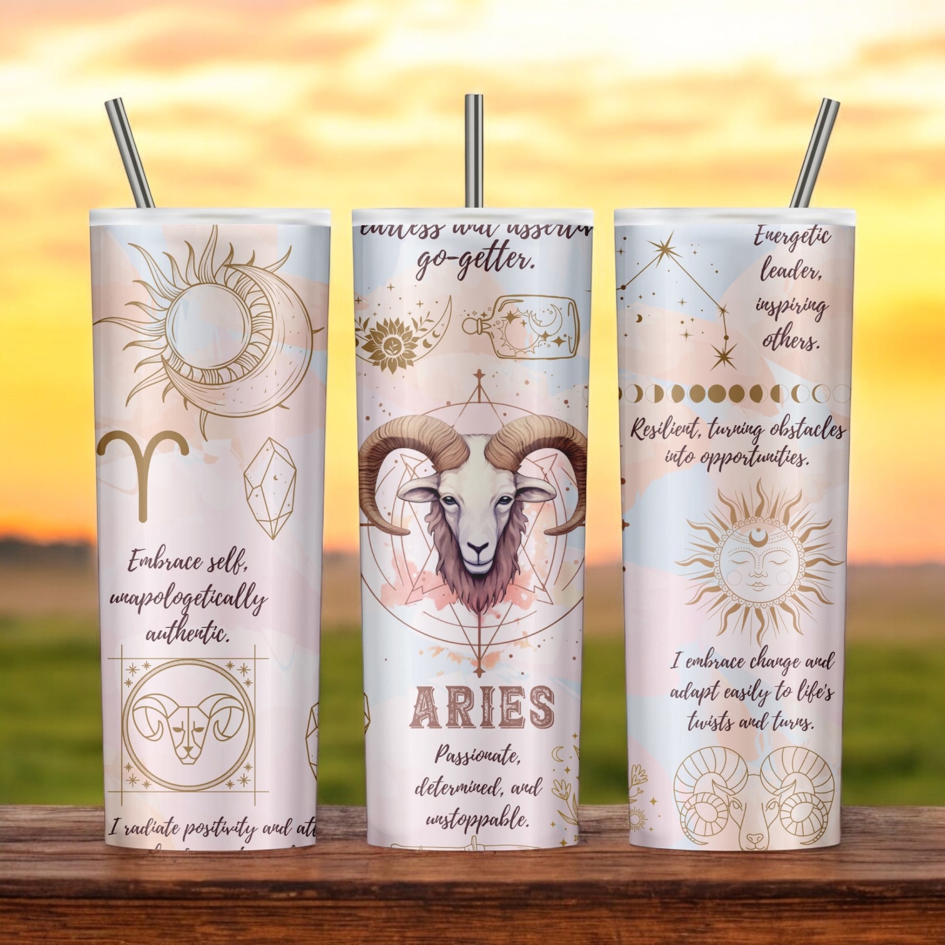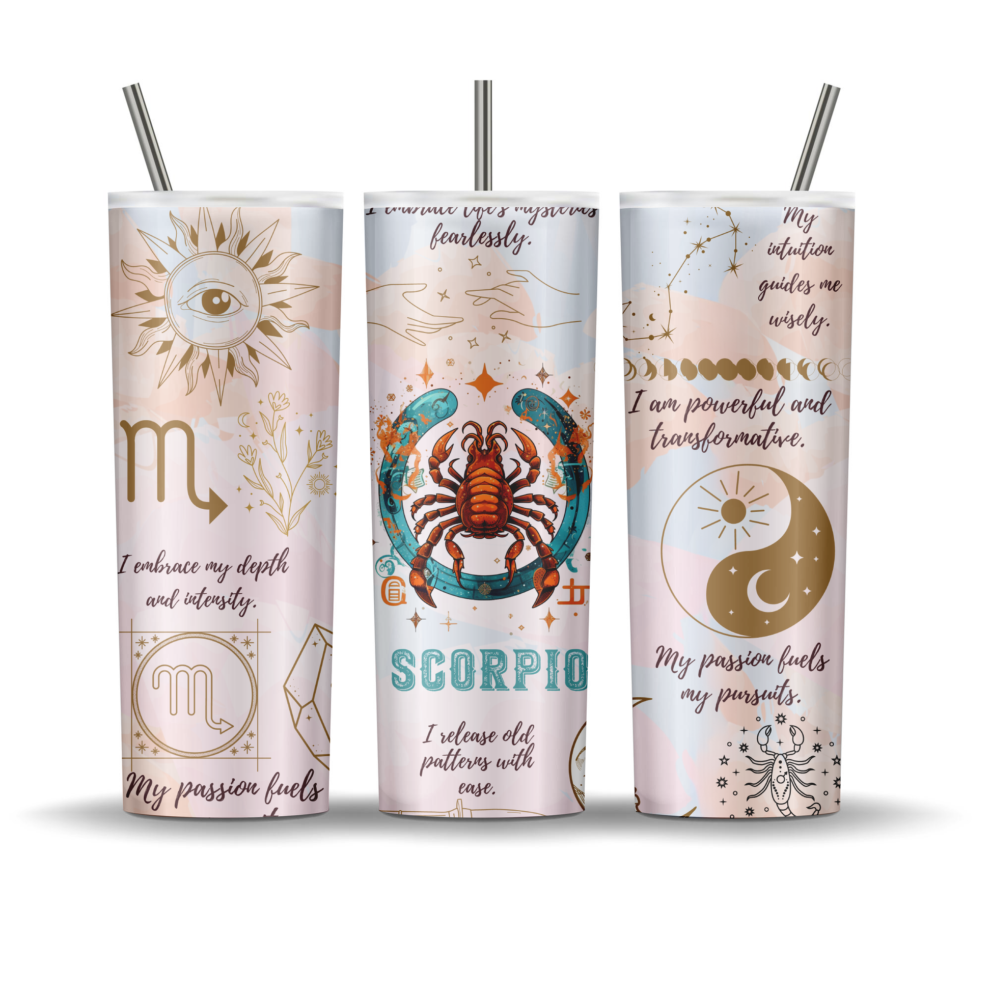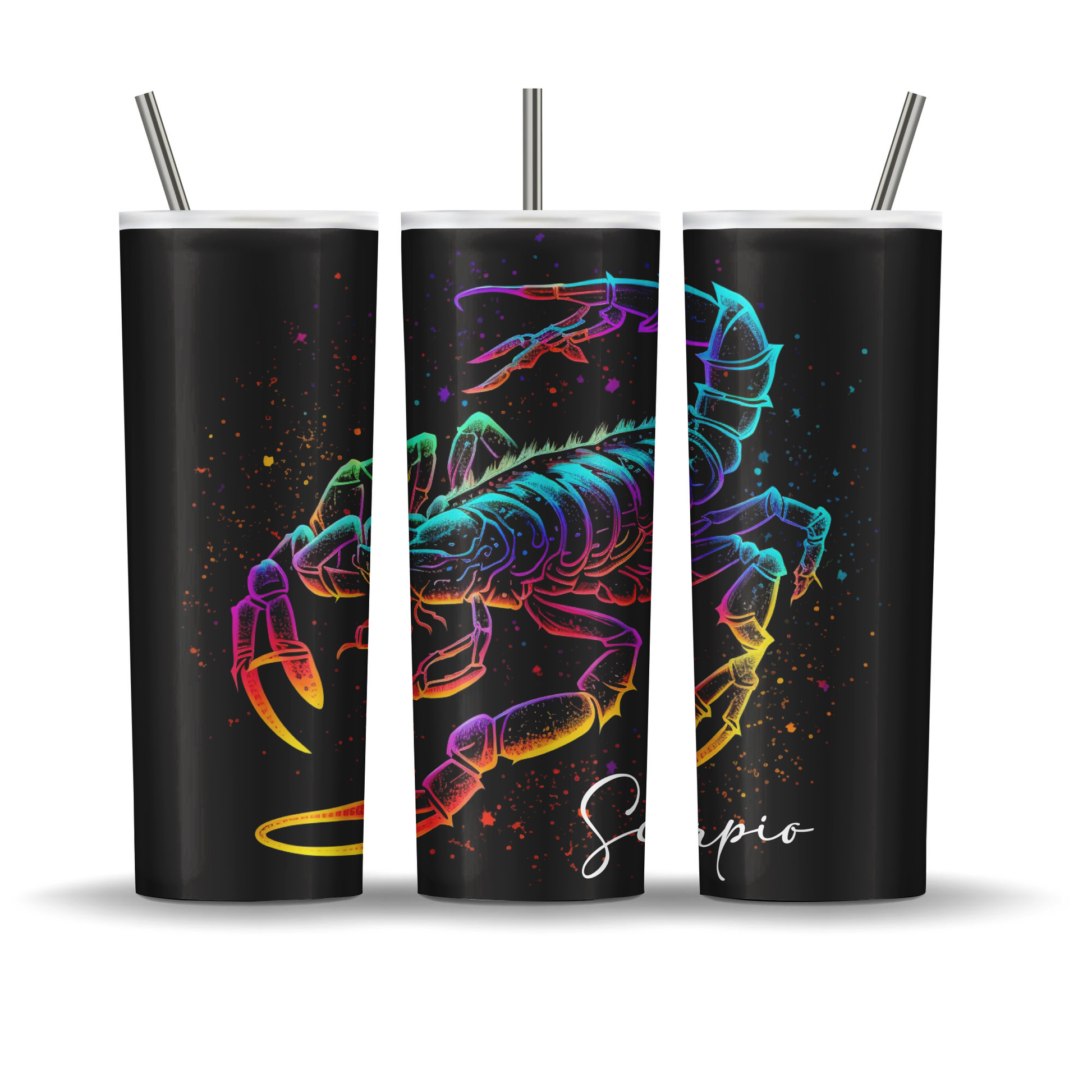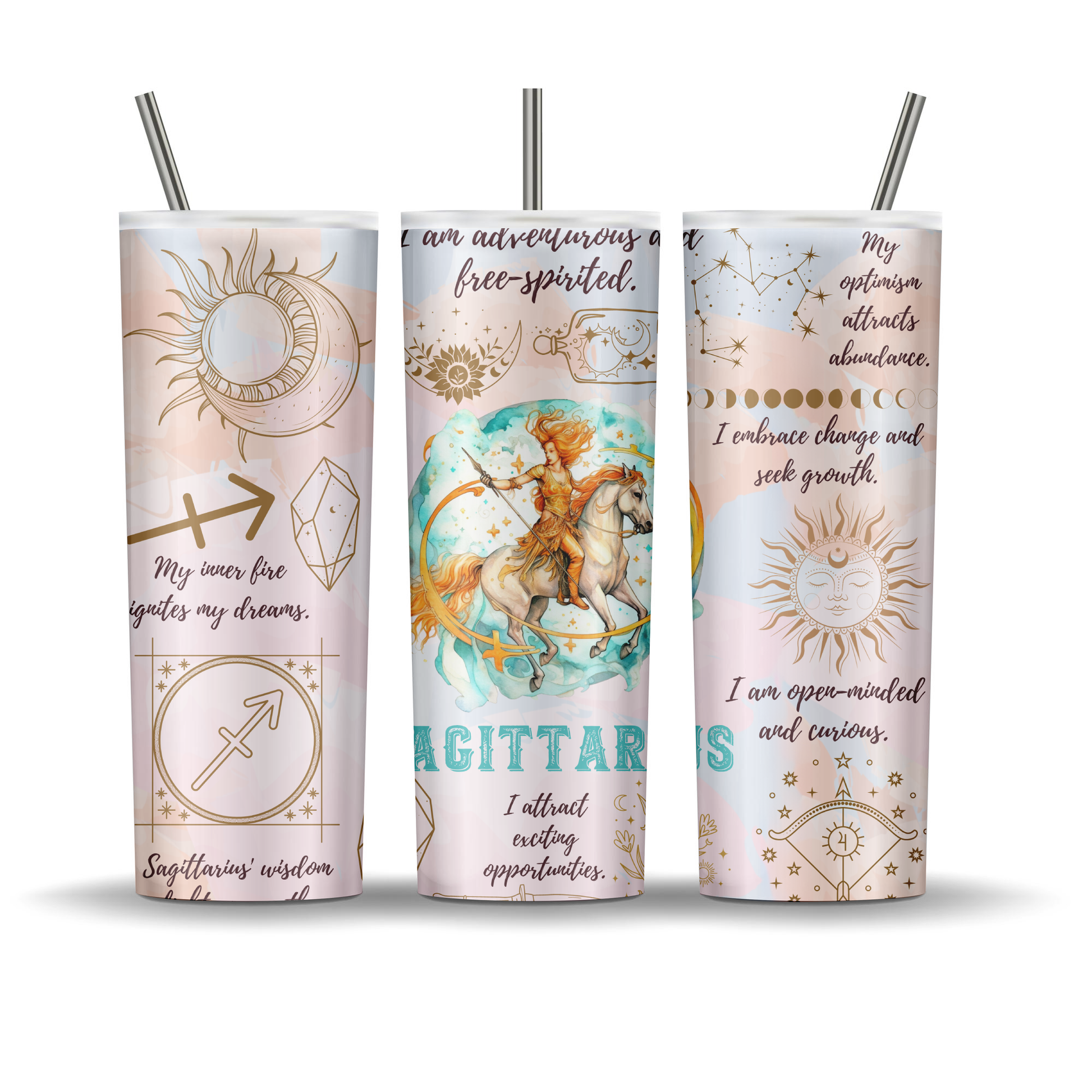 20 oz double walled stainless steel tumbler. Keeps drinks cold up to 12 hours. Comes with leak proof lid and plastic reusable straw, a metal straw, a rubber bottom, candy, coupon code to website, and a care card.
