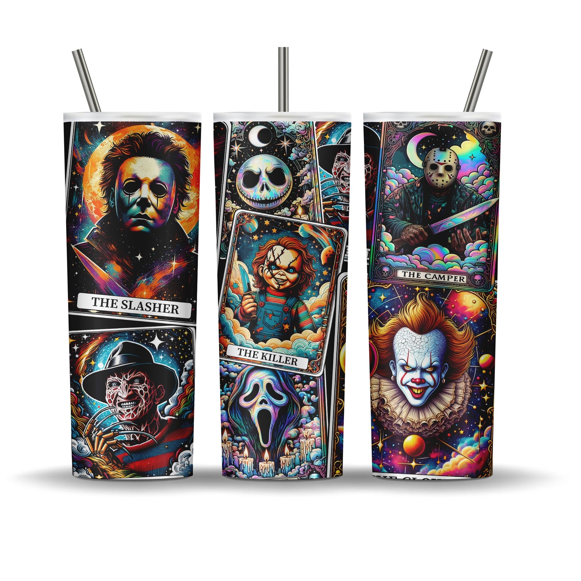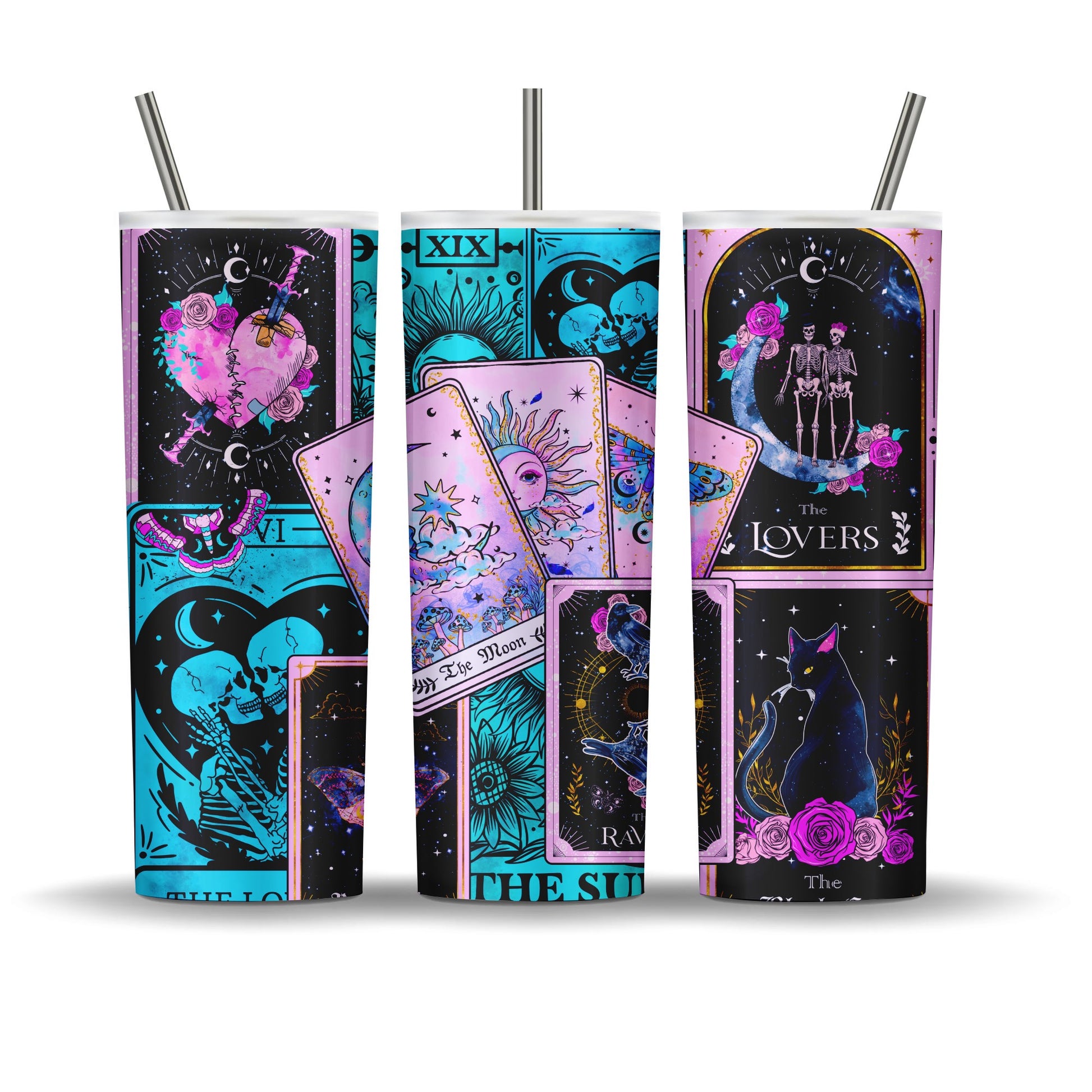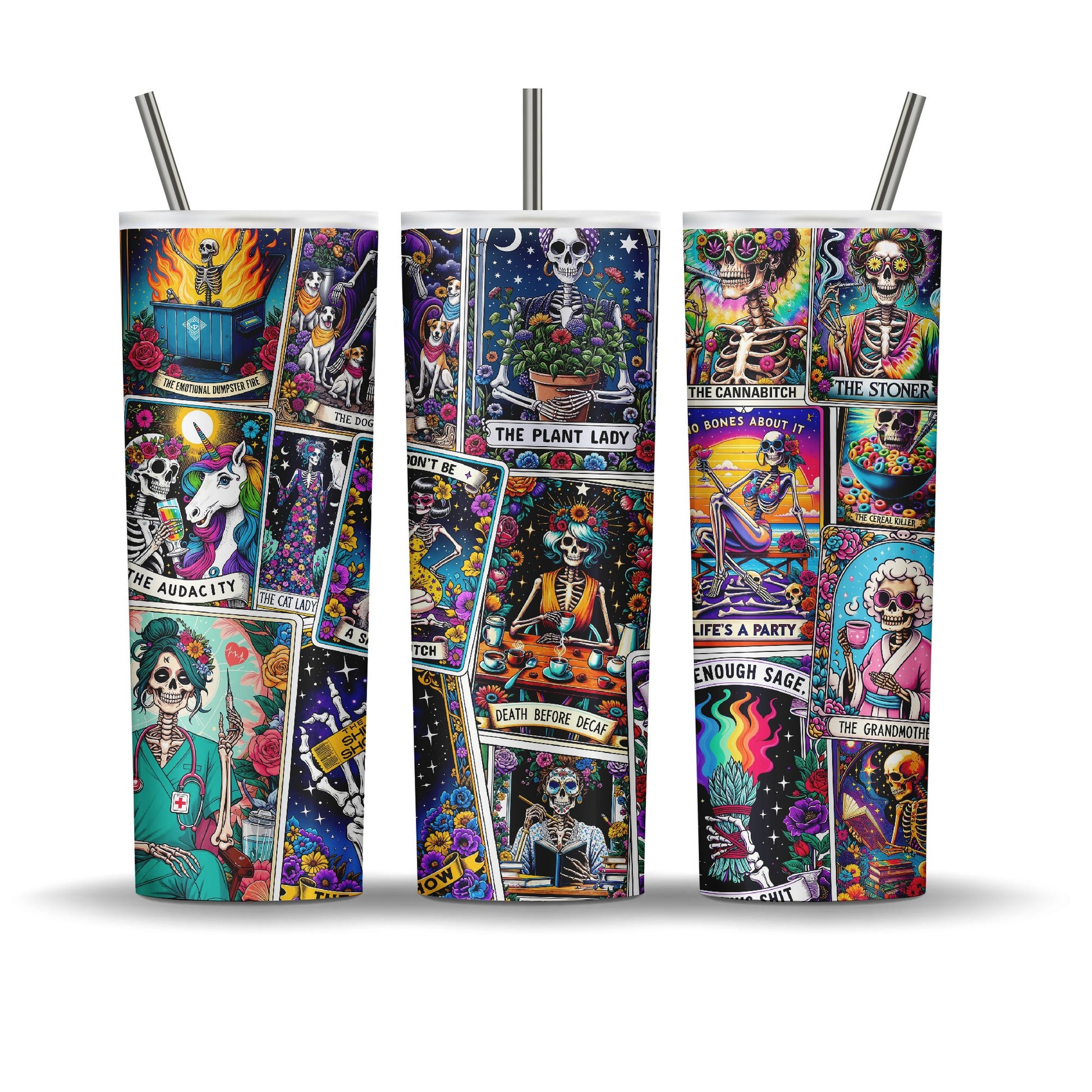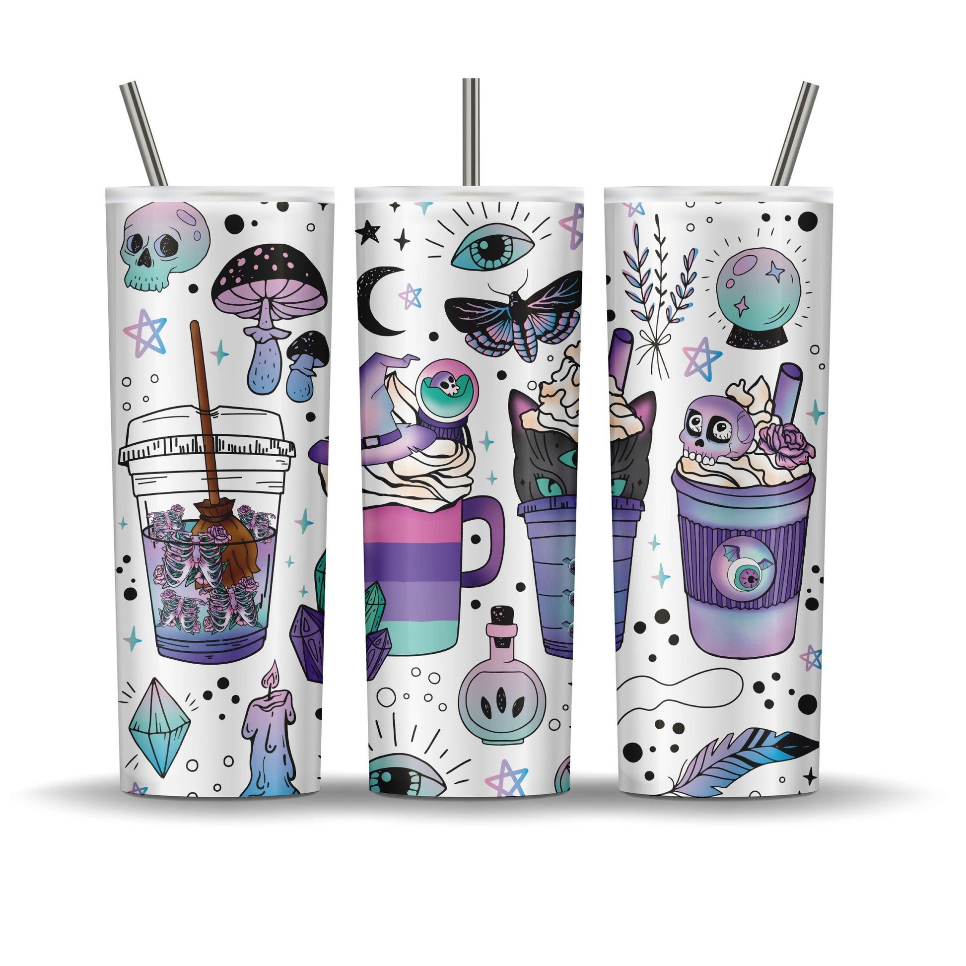 20 oz double walled stainless steel tumbler. Keeps drinks cold up to 12 hours. Comes with leak proof lid and plastic reusable straw, a metal straw, a rubber bottom, candy, coupon code to website, and a care card.